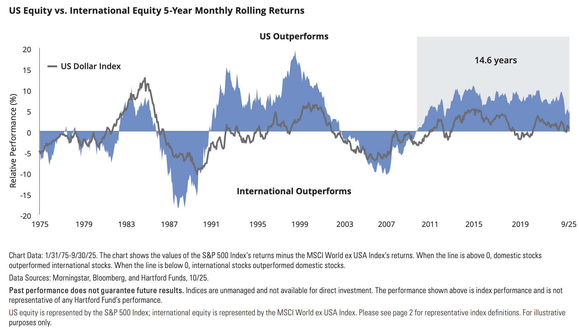 While U.S. equities have enjoyed a period of dominance spanning nearly 15 years, it is important to recognize that markets inherently move in cycles, and we may be approaching the end of this prolonged U.S. leadership phase. Notably, 15 years exceeds the historical average duration of U.S. equity dominance, suggesting a potential rotation on the horizon.