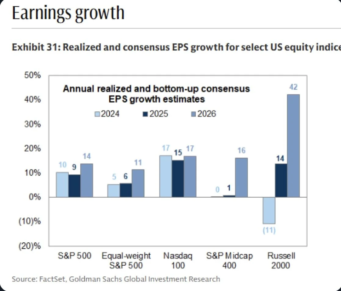 The Russell 2000, a key small-cap index, is projected to experience the highest earnings per share (EPS) growth among major market cap segments in 2026, while still trading a normal multiple when compared to its history. This combination of robust earnings growth and attractive valuation sets a favorable backdrop for small-cap equities, particularly as we enter a mild Federal Reserve easing cycle. Historically, small caps tend to benefit disproportionately from easing monetary policy due to their greater sensitivity to economic cycles and borrowing costs.